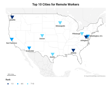 Arlington, which is only slightly behind Seattle, with 38.5% reporting as remote workers, indicates a robust remote work culture.