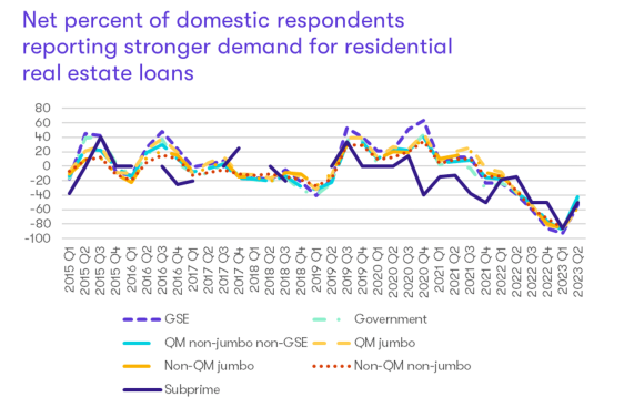 Further, the graph below shows that banks reported lower levels of demand compared with last year in many categories, matching Zonda’s housing data on lower total sales.