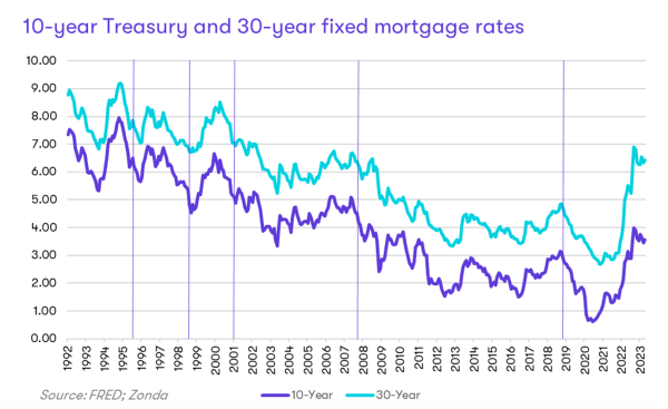 We interpret this as traders reacting in advance of monetary policy, taking into account current economic conditions and projections. The 10-year Treasury yield and mortgage rates typically trend down in recessions, a condition often, but not always, accompanying rate cuts.