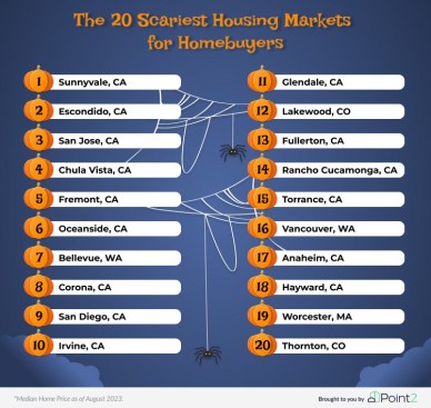With 30-year fixed-rate mortgages climbing toward 8% and limited inventory available, there is plenty to be scared of in the housing market for prospective buyers. In honor of Halloween, Point2Homes analyzed the largest 200 housing markets in the country to determine the scariest markets, based on median price, year-over-year differential in home prices, differences in for-sale inventory, and fewest days on the market.