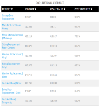 Garage door replacement topped this year’s list, with a national average job cost of $3,907 and national average value at sale of $3,663, or a 94% return on investment. Manufactured stone veneer installation came in second, with a 92% recoup on investment.