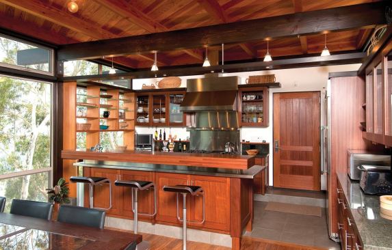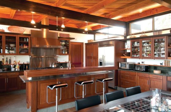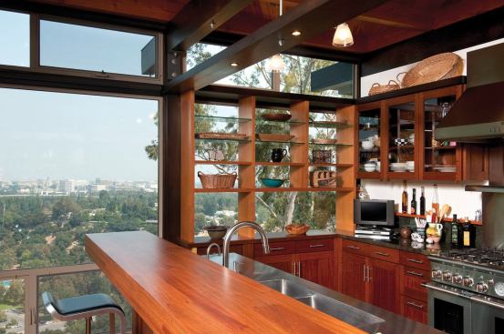 To understand this kitchen configuration, one must first understand that it is part of a house designed in homage to California’s post-and-beam case study houses of the 1950s. Although the original 1,300-square-foot home (built in 1956) on the steeply cascading slope was too decrepit to salvage, D.S. Ewing Architects maintained its spirit by repeating the same pivoting (at a 12 percent angle) floor plan shape in the new design. An exact replica was impossible, however, given that the new house had to conform to more restrictive hillside ordinances and stringent fire codes.