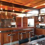 Perched on the top floor like a tree house, the kitchen enjoys one of the most panoramic vantage points. To preserve those sight lines, the architects specified open bamboo shelving on its view side, enhancing the illusion of space. Rich natural materials make up for in quality what the modest galley lacks in square footage. Those include Honduran mahogany cabinets, wenge counters, custom stainless steel detailing, concrete tile flooring, and tailored lighting.