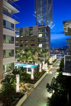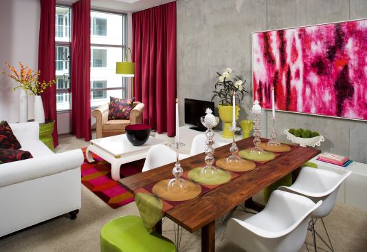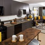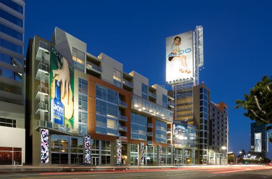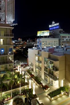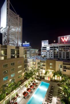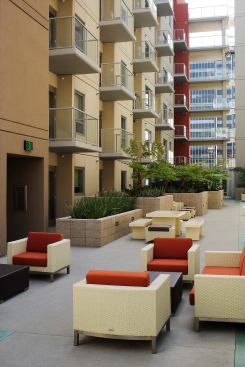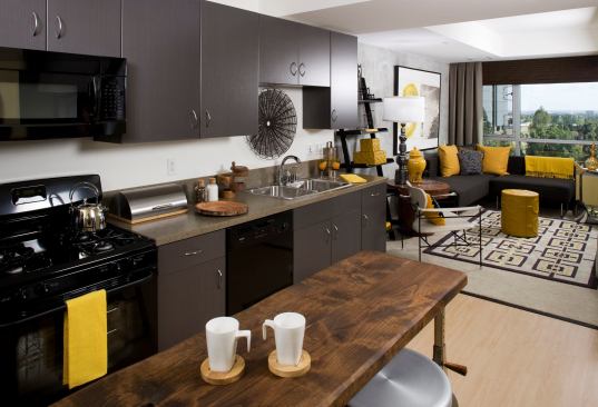 If you want a peek at the latest style trends, look at high end hotels. That’s easy to do in this mixed-use urban village at the crux of Hollywood and Vine, where 375 designer rental units share a city block (and a grand valet entry) with a W Hotel and W Residences. Located above a metro rail station, this iconic city neighborhood offers everything a hipster could want, including a sixth floor pool and spa, an expansive deck and outdoor recreation area, a sports bar lounge, a fitness center with a yoga and Pilates studio, a business center, a conference room, an outdoor fireplace and fire pit, rooftop dining, a zen garden, and the occasional brush with celebrity along the Hollywood Walk of Fame. Six super graphic billboards generate additional revenue, and murals by local artists adorn the building facades. It’s a high energy hot spot targeting 25 to 40-year-old professionals who work and play in the entertainment industry.