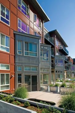 Mention a density of 150 units to the acre, and this is not the sort of project that comes to mind. Shouldn’t it be taller? Or more cramped? Located in a former industrial area in the midst of a renaissance, this mixed-use enclave weaves 127 waterfront apartments, ground-floor retail, and underground parking into a prime spot adjacent to public transit—and still manages to create killer lakeside views for every resident. Terraced massing on the waterfront side not only mitigates the density, but opens up views (even for basement units) and forms a series of shared rooftop decks and private outdoor patios. Public stairs along the property’s north edge link the busy avenue up above to garden and lakeside areas below.