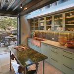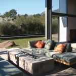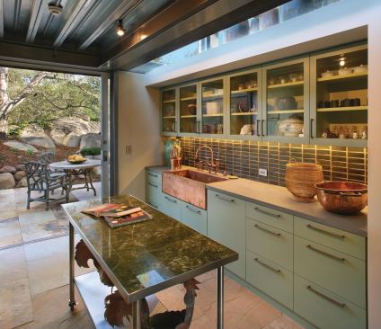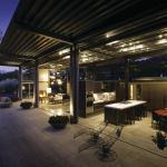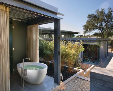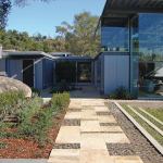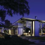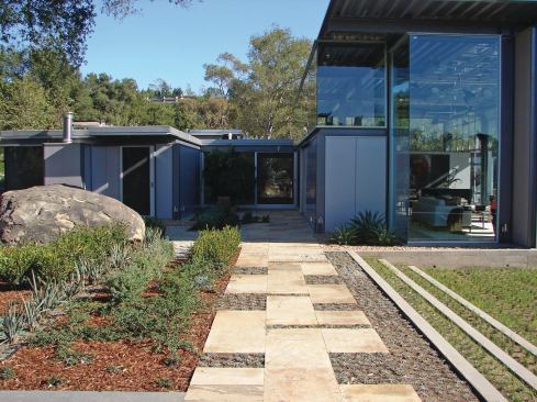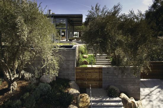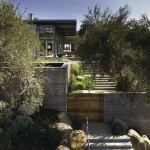 The layout is largely influenced by the topography of the site, with its protected oaks and large boulders, and the construction adheres to sustainability and energy-efficiency principles. In addition to its passive cooling, the home features an in-floor radiant heating system that is fed by solar collector panels, highly efficient boilers, an Energy Star–rated cool roof, and photovoltaic panels.