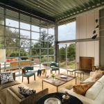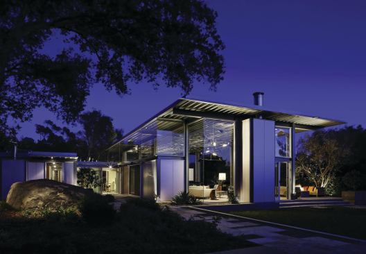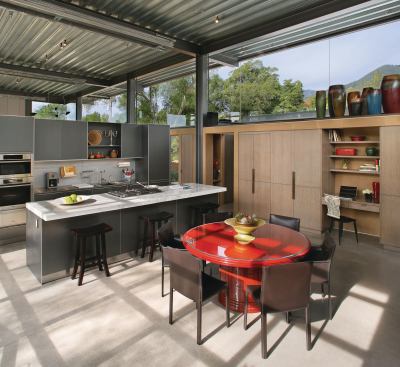 Constructed largely of exposed structural steel framing, exposed concrete floors, and insulated metal panels, the home is located above the hills of Montecito and takes full advantage of the indoor-outdoor living made possible by its setting.