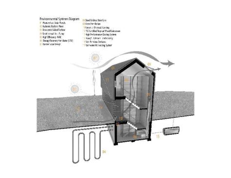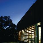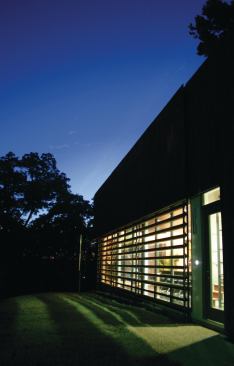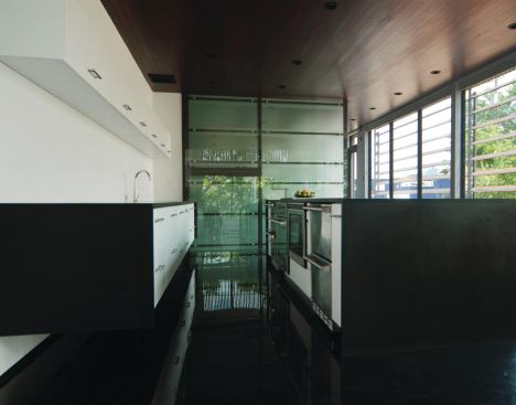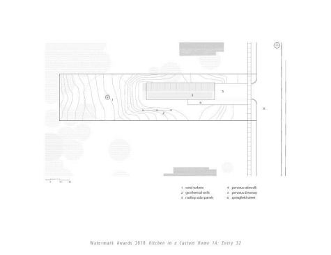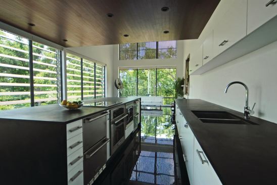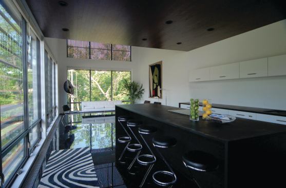 This sleek kitchen offers a full-bodied taste of the larger green agenda in a house that is completely off the grid—one destined to become the first LEED platinum-certified residence in the Kansas City metro region. On the matter of sustainability, it hits all the important points, incorporating Energy Star appliances, low-VOC paints, low-flow plumbing fixtures, recycled paper composite countertops, an induction cooktop, and operable windows and skylights to create a stack ventilation effect. All this occurs inside a concrete thermal mass envelope with radiant floor heating to minimize temperature fluctuations, thereby cutting down on energy usage. And it’s an urban infill structure in a rundown part of town that is badly in need of revitalization.