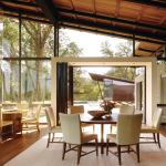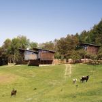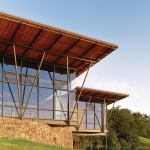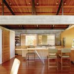 “The property extends almost two-thirds up the ridge,” says architect Richard Schuh, pointing to a spot on the distant slope. “It’s almost the whole watershed here.” Responding to the power of the site, Schuh and his partner, Amy Nielsen, chose “materials that had a rugged texture and a structural integrity, so there’s a sense of how the house is built.” Three parallel walls of exposed board-formed concrete organize the compound, running through the main building and composing the colonnade that links it with the guest pavilions. Rising some 30 feet from their footings, the massive walls support a steel framework that seems delicate in contrast. “Exposed structure can look really clunky,” Schuh notes. “We wanted to take that idea and pare it down.” Light steel I-beams carry a roof structure of Douglas fir purlins and decking that projects far beyond the outside walls. Each component—concrete, steel, and wood—stands as an independent object; every connection is satisfyingly visible and plain in its function.