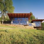 Tucked into the trees at the edge of a sloping pasture, the compound consists of a two-bedroom main house, a pair of twin guest pavilions, a swimming pool, and a garage/recreation building with a children’s bunkroom above. The elements, arrayed in roughly pinwheel fashion, surround a courtyard centered on a huge madrone tree. To the north, where the grade falls away, the buildings cantilever over stone retaining walls. Under great, overhanging shed roofs, their high glass walls face the pasture, which descends into a valley and climbs the opposing slope.