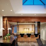 The courtyard Engle refers to is an airy living and dining room at the house’s center, where a 12-foot-9-inch-by-9-foot skylight, and the ipe wall, make it feel like it’s outside. Interior clerestories let light through to the master suite, entered through a pivoting door behind the living room. Four steps up beyond the bedroom is a second bath adjoining the husband’s office, and an outside entrance.
