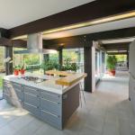 Natural sunlight beams through floor-to-ceiling triple-glazed windows onto rooms throughout the Huf Haus kitchen.