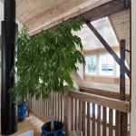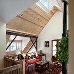 Like any barn, this one was built to house rambunctious farm animals and heavy loads of feed. The structure is oriented on a north-south axis. Ventilation and rain protection were key; human comfort and optimal sunlight were not. The barn’s long walls, exposed to the east and west, were sunbaked in summer and wind-beaten in winter, and it was costing Burnett a fortune in utility bills. While the sun’s position and the weather are both non-negotiable, the barn’s insulation problem was definitely fixable. Part of the solution lay in using an open-cell spray insulation foam. In addition, a geothermal HVAC system that uses both hot air and radiant heat was installed—a smart choice because of the boost it gets from the ground temperature. Even the residual heat from a wood stove is used to heat the floors via a buffer tank in the heating loop.
