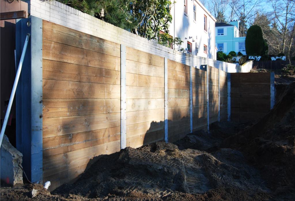 8. At the completion of the shoring install, the area behind the wall is ready for drain mat or pea gravel which provides for free-draining of future storm and groundwater. A quarter inch gap is typically left between the lagging to allow water to pass through the drainage material, then the lagging gaps, ensuring proper drainage at the neighboring property. From there, final backfill material is placed and the remaining earth at the low side of the wall is removed.