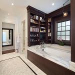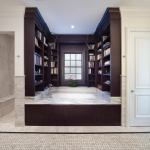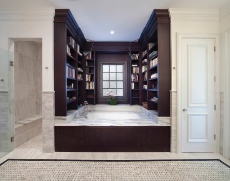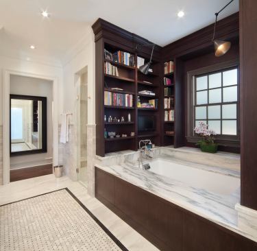 The lady of the house asked for a unique bath retreat that combined her favorite things: bubble baths, books, and music. Builder/architect Phil Kean delivered with what amounts to a master bath library. Its deep soaking tub is set in marble and ensconced in mahogany wood bookcases. That same combination of materials carries over to a custom vanity. The traditional look, Kean says, maintains the architectural character of this Georgian-style home.
