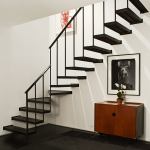 Cutting a hole in the floor of her home was the easy part, recalls Berke, who mentions that getting the stairs right was one of the bigger challenges of this duplex remodel. Vertical pieces of steel support the cantilevered cast-iron treads; every tread has its own support piece. Those supports are concealed within the wall, so the open staircase appears to float.