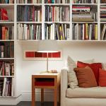 The stairs end up making way for a feature that’s rare not just in apartments, but in modestly sized homes of all sorts, be they cottages or apartments: graceful circulation spaces. Off the apartment’s street entrance is an entry foyer at the foot of the cantilevered stairs. At the top of the stairs, turn right and you’re standing at the entrance to the library (originally the living room of the second-story apartment), where the family spends much of its time hanging out together—dogs included. Berke notes that those transitional or ‘welcoming’ spaces often get skimped on. “As such, the apartment feels smaller,” she says. But when you give a little square footage to the in-between spaces, she adds, the home actually feels bigger.