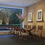 Moveable walls in the dining room conceal storage closets. On the doors are ledges for displaying art.