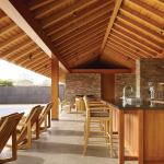 The sections are constructed largely of exposed timber and stone, and each building “is designed to express individual elements thus clarifying and celebrating the assembly,” the firm says. “The sliding walls and intimate scale of each building allow them to open directly to the garden on all sides.”