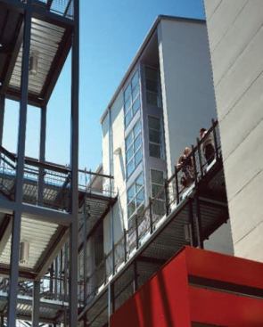 RULE BREAKERS Designing a building in two jurisdictions with different codes can be a nightmare. The developers of GreenCity Lofts wanted to build up to 75 feet, but the height limit in Emeryville, Calif., is 30 feet, while the limit in Oakland is 65 feet. “We needed a variance for height,” says architect Robert Swatt, but “we needed to have compelling ideas” to justify breaking the rules. Fortunately, the project’s green ethic and contextual sensitivity were plenty compelling. Up to 30 feet, the buildings’ eave line is set to align with neighborhood buildings; then the massing steps back and climbs higher. “The form reflects [the industrial/residential trend] happening along the street, and the cities appreciated that,” Swatt says.