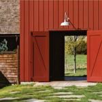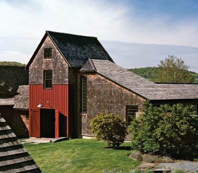 The dominant visual element of the arrival court at this Hudson Valley farmhouse is a barn-board-clad tower, which serves as an entry point and links the main wing of the house to the guest quarters. The entry under the tower is like a breezeway with big barn doors on each side.