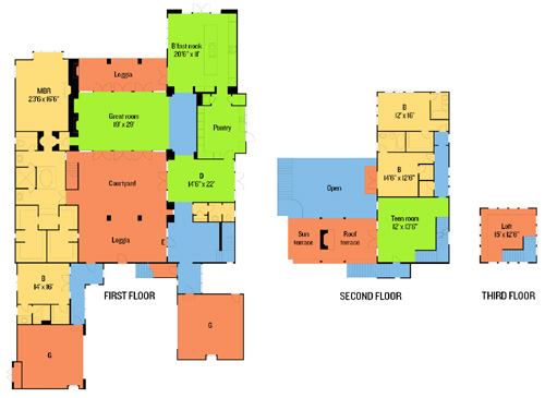 Designed by Bob White of Forest-Studio, with the Ritner Group as architect of record, Plan 2 offers a decidedly casual form of luxury, marked by low-profile building forms, a palette of organic materials, and connections to the landscape at every turn. No doubt its generous open-air courtyards, patios, and covered loggias off both the first and second floors get plenty of use in this balmy, 29-home Laing Luxury Homes enclave. And inside, there’s something for everybody: three to four bedrooms, a great room, a morning room, a “teen room,” and a butler’s pantry to name just a few of the features that make this residence super livable.