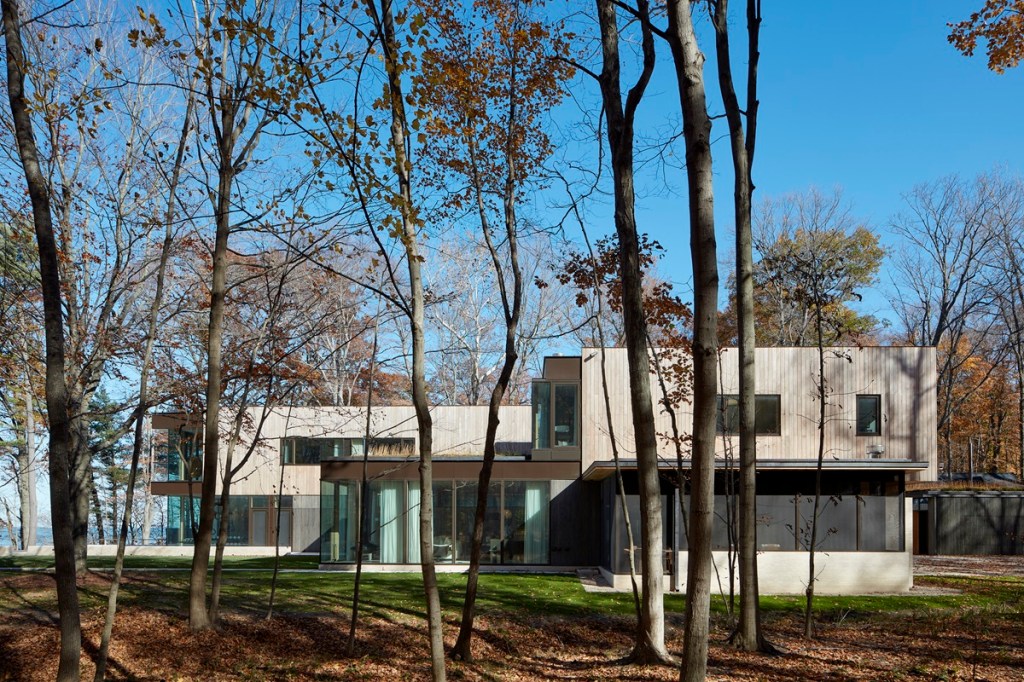 “[The site] has this amazing lake view, but it also has this incredible woodland view. That was a unique opportunity [for us], having the ability to experience both simultaneously within the project,” Jon Heinert, principal for Wheeler Kearns Architects says. “Because it was such a big property and it has an adjacent lot to it that is unbuildable and entirely woodland, that made the lot itself feel much more expansive.”