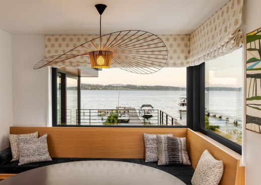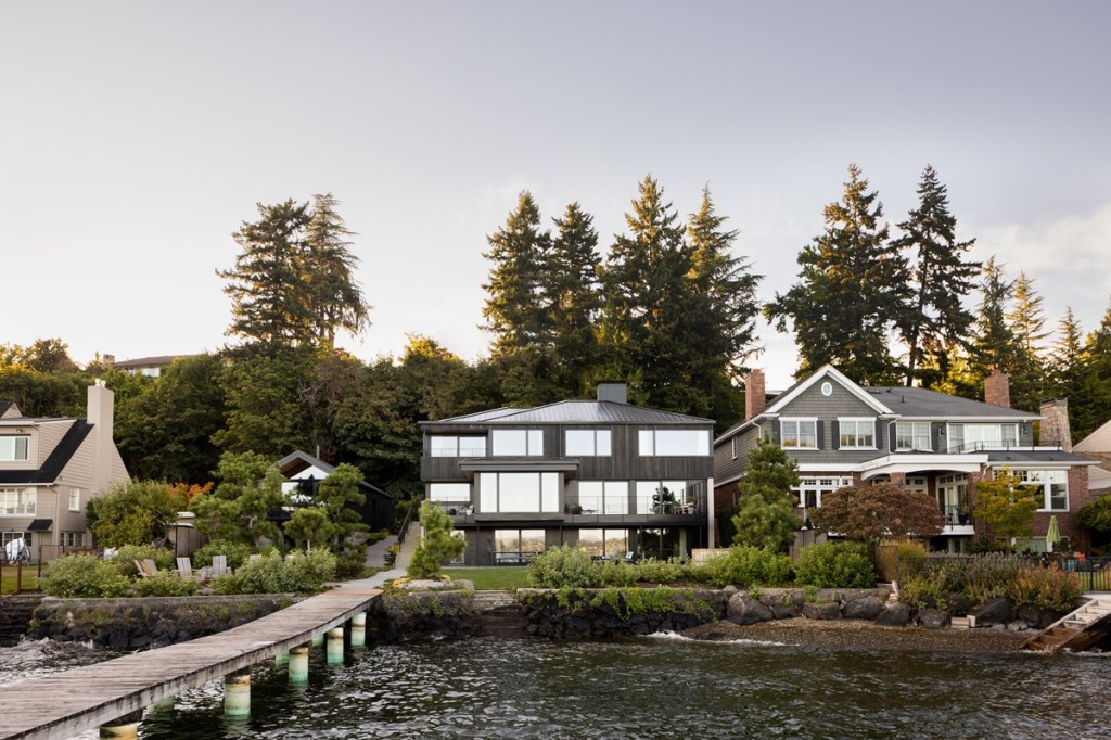 The main level interiors were opened to create an open living, kitchen, and dining area to maximize views of the lake—and, on clear days, Mount Rainier. The upper floors were reworked to include en-suite bedrooms, while the basement was equipped with a kitchenette, large living room, laundry room, and new bathroom, offering an entertainment-ready space with easy access to the lake. A detached accessory dwelling unit (DADU) was added to the west side of the homesite to serve as a garage, boat house, office space, guest quarters, and additional storage. The DADU is dressed in the same Suyaki cladding to visually connect the structures.
