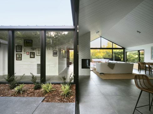 Michael Hennessey Architecture facilitated these desires by organizing the house around a central courtyard that maximizes the house’s softly lit northern orientation and minimizes the harsh sunlight from the south-facing front deck.