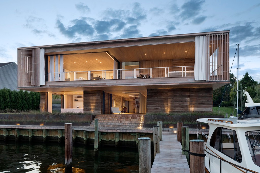 The outermost layer of the new home is the bulkhead itself, with a 2×8 ipe deck sitting on top and connecting several docks to the property. Deep overhangs protect the house and provide shade to the decks that surround it.