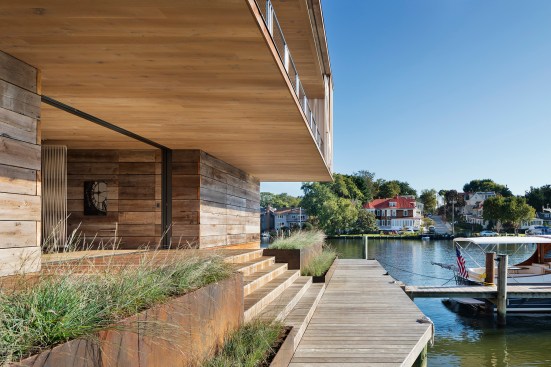 The architects used materials for the various layers of the home to reflect the character of the working harbor, including weathering steel planters, 3×14 reclaimed heart pine siding, and woven rope and sail cloth details. The LEED Gold house employs LED lighting, geothermal heating and cooling, white roofing, and two layers of solar shading to reduce energy demands.