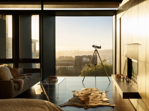 With remarkable views of the city skyline to the east and the Sutro Tower to the west, the architects chose to open up the front and rear façades and employ 20-foot-tall, 30-inch-deep steel brise soleils to deflect light and simultaneously frame the remarkable views and edit out less desirable ones. The southern and northern anchor walls are skinned with hand-troweled plaster and create visual and mental privacy from the adjoining neighboring homes.