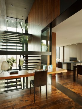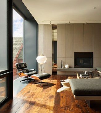 Inside the new 2,820-square-foot home, the main living areas are situated on the second floor, with the children’s bedrooms on the ground level and the new master suite on the top. Numerous species of wood “that exude visual and tactile warmth” were incorporated and custom built-in furniture maximizes function within a modest building footprint.