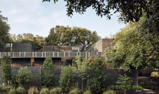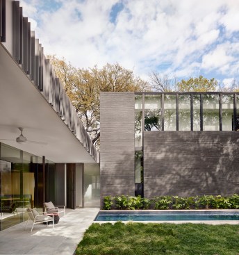 “Tarrytown is in transition from a middle-class neighborhood of ranch-style homes to a more tony precinct of immodest stucco and limestone villas,” says Kevin Alter, partner at Alterstudio. “In this regard, our design attempts to resist this trend and offer a more contextual alternative. The single-story main volume and black brick nod to the scale and character of the surrounding ranch-style homes, while providing a new character and aesthetic. Carefully planned around the circumstances of its situation, the existing trees and topography provide the focus and character of the exterior courtyards, which in turn infuse the home with a compelling and an ever-changing interior environment.”