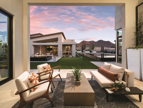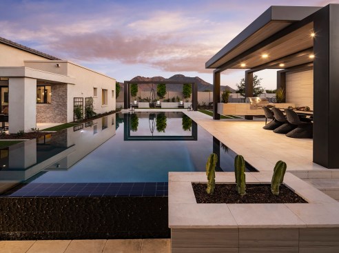 The Ambrosia model showcases the guest casita, a luxurious pool, an adjacent covered dining area, and several other modern structures and features by landscape designer Creative Environments.