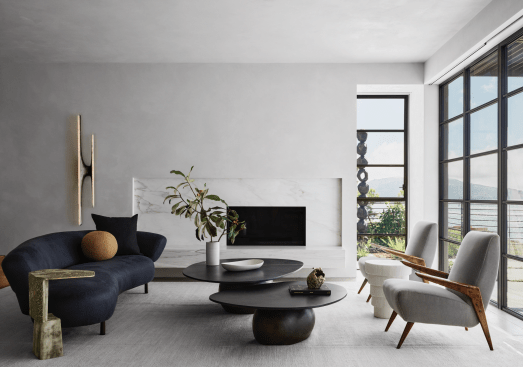 Approximately 80% of the original exterior structure was preserved, with steel-troweled cement plaster, Kebony wood cladding, and a copper standing-seam metal roof replacing the foam detailing and stucco. The back portion of the house was removed to help accentuate the sweeping views from the newly created great room.