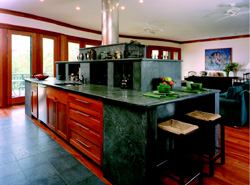 THE HAND-CUT PIETRO CARDOSA STONE CENTRAL HEARTH, TOPPED BY A POLISHED stainless steel chimney, ensures there is always a fire in this kitchen. The fireplace provides an unusual barrier between dirty dishes and guests while still allowing conversation to flow easily.