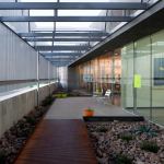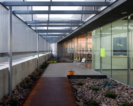 Above the courtyard, solar panels are used as a shading element. “We spaced them and angled them to allow the maximum light to hit them, and on the space in between we used a polycarbonate panel to filter the light, which creates a nice, naturally day-lit space,” McLain says. The judges remarked on the “great design, which satisfies both function and form.”