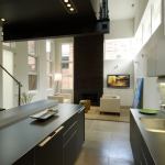 After removing the main bathroom from beneath the stairs to allow in more light, Honarkar joked that “it would be cool to hang the bathroom because there is nowhere else to put it.” The remark became a reality, with a room hanging from steel beams under the third floor, just above the kitchen island. Access is off the mezzanine. “The owner thought we were kidding,” Honarkar says. “But once we showed him the renderings, he liked the idea.” The plumbing is underneath the bathroom floor.