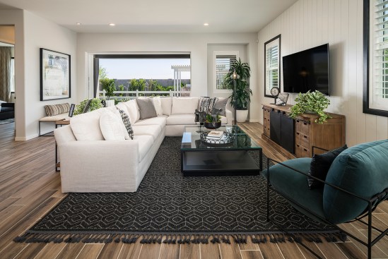 The Bowie model in the builder’s Mosaic Collection was designed by BSB Design and targets entry-level, first-time, move-up, and move-down home buyers. It comprises three bedrooms, two bathrooms, a two-car garage, 1,944-plus square feet of living space, and a resort-style backyard. The floor plan was named Best Single-Family, Under 2,000 Square Feet, at the 2021 Gold Nugget Awards.