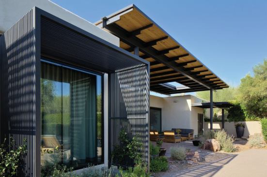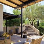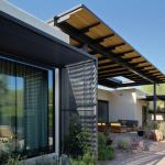 Cylindrical steel columns support the steel and Douglas fir awning. The columns closest to the house line up with existing supports while outside columns stand farther apart. Their placement means the columns fade into the background and the canopy appears to float unsupported. The awning sits 2 feet above the roof enhancing that illusion. The extra space also invites breezes to pass through for increased cooling. “By pulling the canopy up and away from the roof,” Paulus adds, “you still get the sense of this big blue sky that we’re famous for.”—S.D.H.