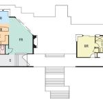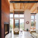 One approaches the house from the uphill side, descending from roof level to an upper-level entry at the central pavilion. An interior stair descends another flight into the main living space. The master suite occupies a semi-detached pavilion a half-flight up from this common area. Guest quarters face the main building across a courtyard centered on a massive outdoor fireplace. From the exterior, the architecture is defined by nearly flat sod roofs and the exposed timber structure that supports them. Interior finishes are appealingly raw: concrete floors, exposed wood and steel framing, fireplaces faced in Corten steel. Concrete retaining walls exposed at the interior bear the wood-grain imprint of their board forms. Every surface reinforces the impression of a building that grew out of the earth. The effect was not lost on our judges, who noted the project’s remarkably successful integration of site and architecture.