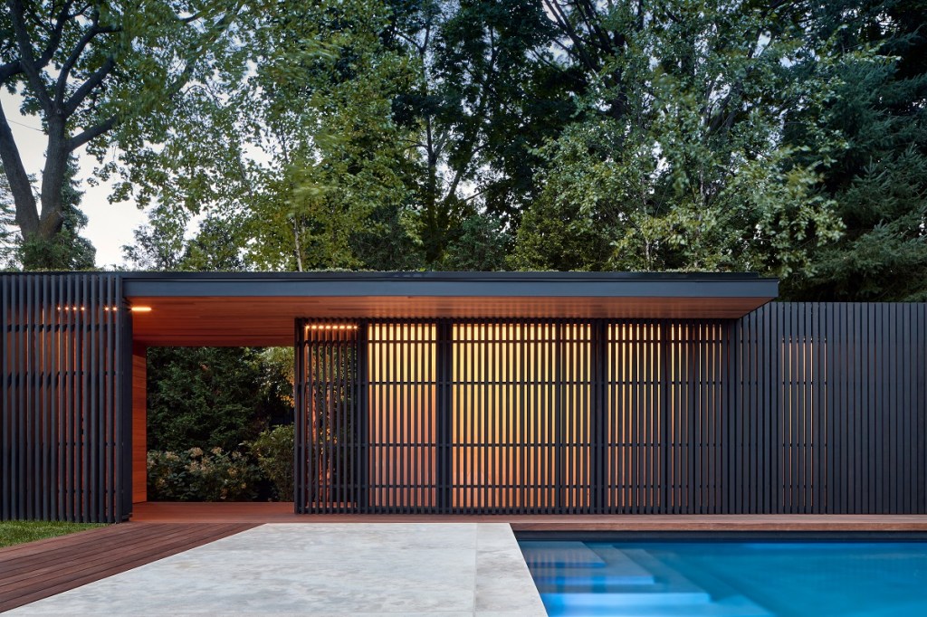 Created to match the home’s new appearance, the cedar-and-glass pavilion and surrounding garden space extend from an exterior renovation in Toronto’s affluent Forest Hill neighborhood. Replacing a more traditional pool house and round-edged pool, the backyard is based around the arrangement of geometric shapes, with hard edges softened by greenery and vegetation.