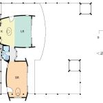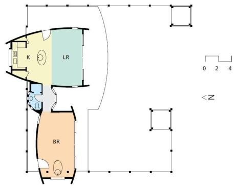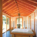 Moskow’s years as a boat builder also served well for fitting a full contingent of amenities into the 800-square-foot plan. A small full bath is tucked into a “knuckle” between bedroom and gathering room. The tiny but functional kitchen occupies the prow of the multipurpose gathering room, and it is detailed for galley-like efficiency. For example, the discreet dish-drying rack (concealed behind an ordinary cabinet door) is placed to drain onto stainless counters that slope toward the sink. Moskow stowed a laundry room and pantry in closets flanking either side of the kitchen counter.