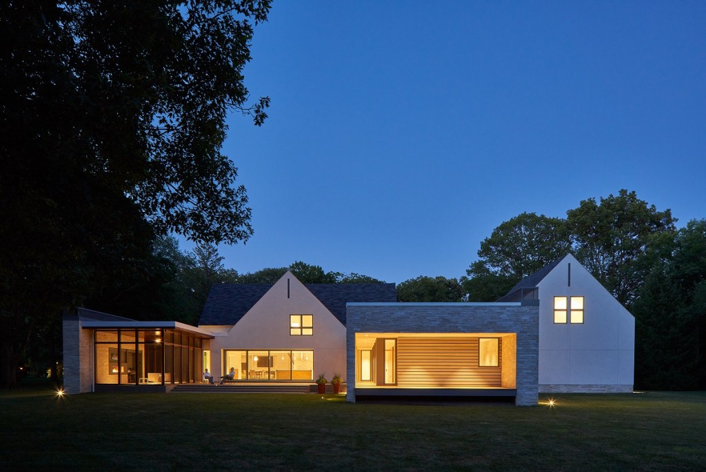 The firm used methodical form-finding and material usage to overcome the challenge of maintaining the house’s original intent while also promoting the home’s new identity. The existing home was stripped to its bones. Interior walls were removed to create connected spaces and bring in light. The aged wood siding exterior was replaced by a crisp white stucco, grounded by a new stacked stone wainscoting.