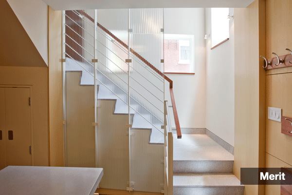The need for a railing became an opportunity for the clients to commission an artwork. With 34 pieces of custom-cut layered textured glass supported by a custom steel stair railing and framework, the sculpted “screen” captures and refracts daylight and is a work of art. “It’s the very first thing you see as you step in the front door,” LaFleche says. “It completely enlivens the arrival experience.”