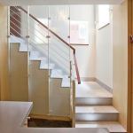For the stair landing into the new basement, the clients saw an opportunity to create a railing that is a commissioned work of art. The stair granite matches the thresholds typical of the neighborhood’s historical entrances. The stair rail is by Wovensteel; the glass screen is from Bendheim, installed by Prestige Glass.