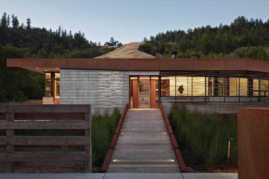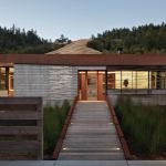 Crook|Cup|Bow|Twist takes its name from the four ways in which wood is deformed by natural elements. That concept is stated up front to the right of the façade’s entryway, by a sun screen whose wooden slats are intended to bend and torque. Rather than fight nature, why not take advantage, wondered architect Neal Schwartz, who searched for the wood most likely to deform over time. He settled on eucalyptus (a non-native species that arrived in California in the late 18th century from Australia), letting the green wood bend and shift with time. On a light steel framework, builder Bruce Hammond used loose pin connections to affix 5/8-inch strips of wood that become more sculptural as time passes.