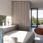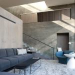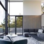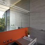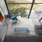 Working with partner Chris Cooper and West Coast collaborator Heidi Richardson, Joseph underscored the building’s directional quality with a two-story wall of exposed concrete that slices through the structure, dividing it into public and private zones. The house’s bedroom, at the entry level, overlooks the living room through an opening with operable screens. A second opening, in the living room, creates a cavelike seating recess with a private window. The product of a challenging monolithic pour, the wall anchors not only the building’s geometry, but also its grayscale color scheme. “We kept this very quiet palette,” Joseph says, “and made the impact with the forms and the spaces.”