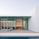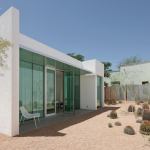 The control and manipulation of natural light figures prominently throughout the house. A narrow skylight washes the living area’s windowless north wall, balancing illumination from the courtyard. Deep glass soffits shelter patios at the living room and the rear-facing master bedroom, while creating soft reflections overhead. The white stucco exterior takes on the color of the sky. “At dusk, before the sky turns color, the walls almost dissolve into the sky,” Hancox says. “At other times, they can be hot pink, or they can be blue.” In a bravura move, the architects captured a rooftop vista with a periscope—yes, a periscope—that projects an image of the distant Tucson mountains onto a mirror that spans the width of the kitchen.